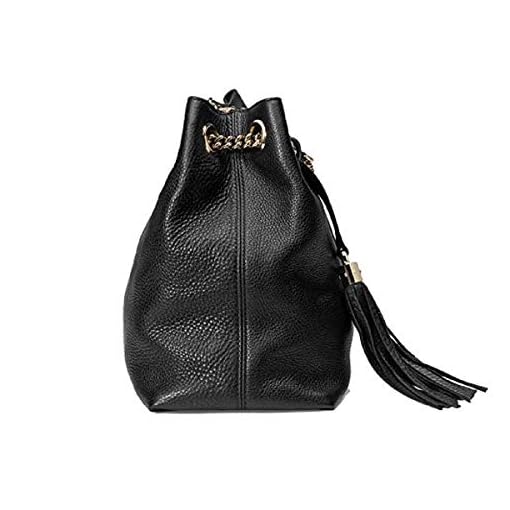 Details: Pebble leather. Light fine golden hardware. Double chain shoulder straps with leather shoulder pad; 7″ drop. Detachable leather tassel.